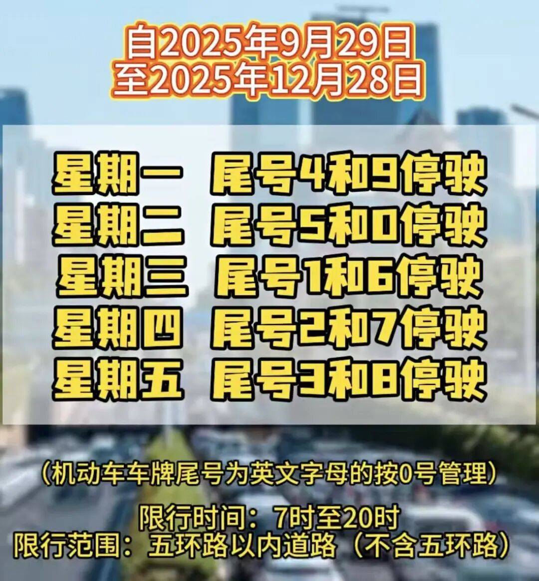 市公安局交管局发布消息,9月29日起,本市将启动新一轮机动车尾号限行轮换。周一至周五限行尾号分别为4和9、5和0、1和6、2和7、3和8。