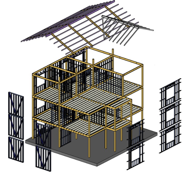 在结构方面,采用了轻钢框架+冷弯薄壁型钢剪力墙的结构体系。采用标准模数构件,均可以在工厂进行预制,运输至现场通过高强螺栓进行拼接,具有较高的装配化程度,方便施工。为了实现结构体系的产品化推广,对于该结构体系配备有多种不同性能的冷弯薄壁型钢剪力墙作为抗侧力构件。在设计方案中,对不同场地条件下的结构采用统一的轻钢框架,以实现框架构件的标准化生产。通过更换剪力墙构件,来满足整体结构的整体设计要求,在满足条件的情况下可以进一步对抗侧力构件选型,使其同时满足经济性,拓展结构体系的应用场景。