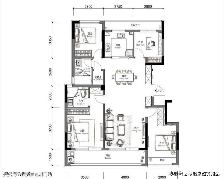 该户型为标准四叶草户型,日常起居能够互不打扰。南向还拥有双开间的大阳台,长度约7.5米。