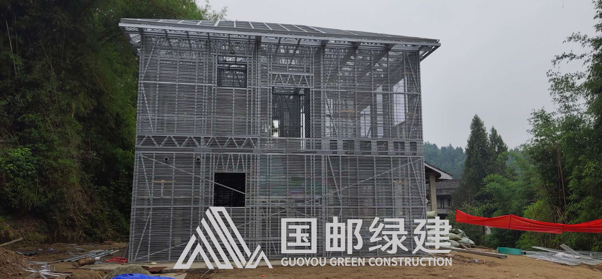 轻钢主体搭建完成后将在轻钢龙骨两侧安装镀锌钢网膜,形成浇筑实心墙体的网笼状围护结构。