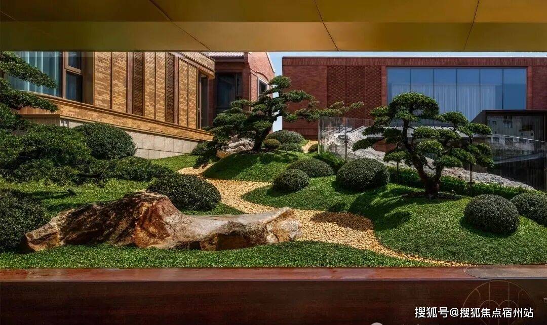 山水庭院汲取《足立美术馆》的造境手法,以老石皮、百年古木原样搬运,重现山间岁月的自然痕迹,与庭院中的光影交织,仿佛将山间的自然采光与静谧之感搬入城市。阳光透过树梢洒落,石皮上的纹理在光影中若隐若现,宛如一幅流动的自然山水画卷。