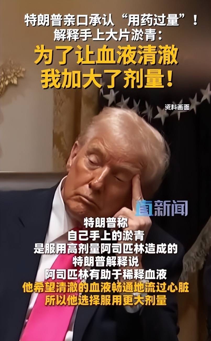 梅奥诊所的指南明确警告,高剂量可能导致易瘀体质。特朗普在采访中承认,他用化妆品遮盖这些痕迹,以免引起更多关注。