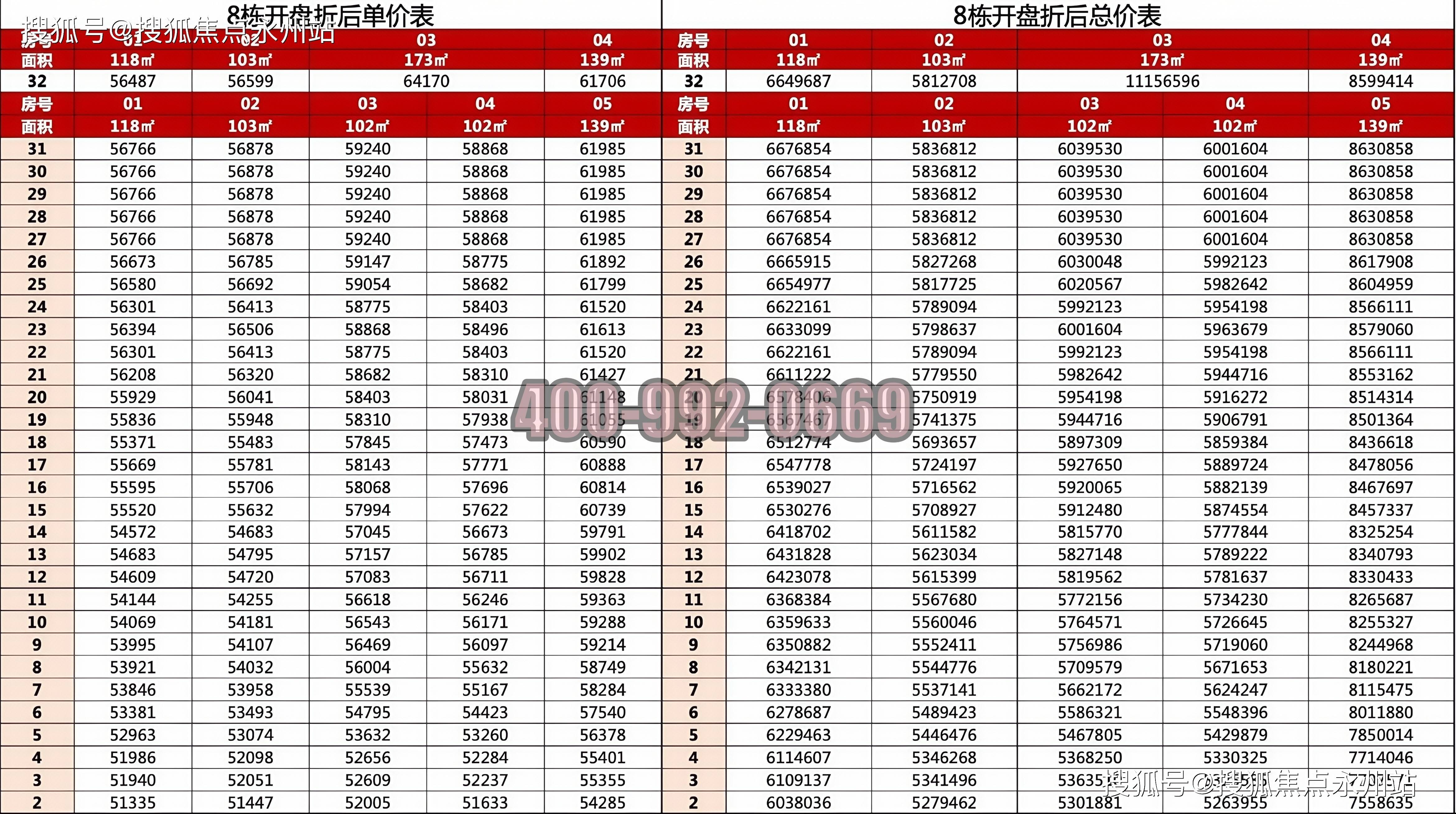 折后价格:开盘享93折优惠,折后均价5.69万元/㎡,折后单价5.13-6.19万元/㎡,总价526-863万元/套。具体户型价格如下: