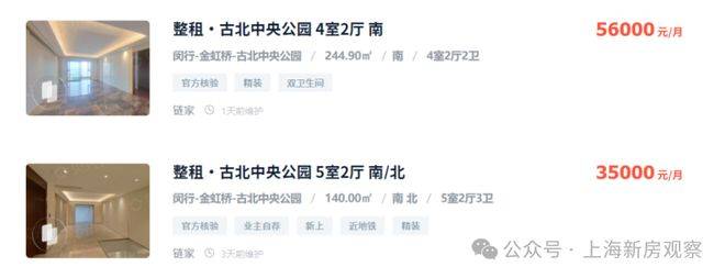 从网上挂牌价格看,古北的大户型房源月租金基本都在35000-55000之间,项目一路之隔的【古北中央公园】,挂牌价格在13-14w左右,161平米的三房,月租金3.8万,可以说投资回报率相当高,而且租客多为驻沪领馆外事人员、外企高管、国际学校陪读家长等,圈层较高且稳定。