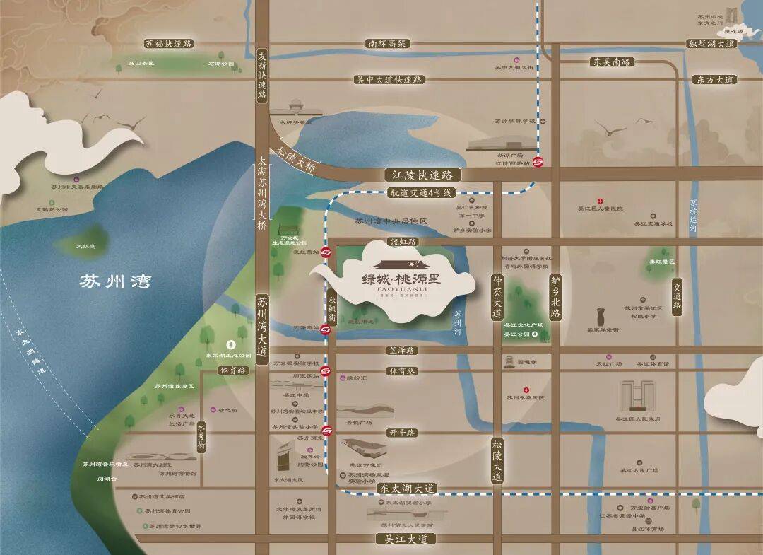 项目坐落于苏州湾的核心板块,万公堤旁,苏州河畔。这里可以说是吴江太湖新城难以复制的宝地。出门不远,万象汇、吾悦广场等大型商场环绕,生活购物极其便利。地铁4号线流虹路站无缝衔接,多条隧道和桥梁让通往全城都畅通无阻。旁边还有苏州湾博物馆、体育中心,以及第九人民医院等优质配套。更难得的是,约1公里内,万公堤、苏州河湾、苏州河交织,自然与人文气息扑面而来,成就了苏州河畔的静谧生活。