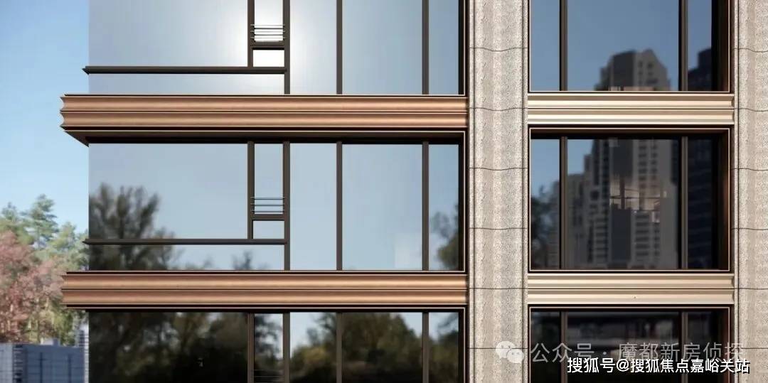 组合,传承经典海派的建筑手法。可视面都是古铜色金属铝板、米黄色铝板/石材、边套270°大转角飘窗,且从正面、侧面到背面,立面都保持精致统一,四面平权尽显高端质感。