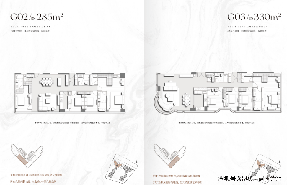 高区的户型则更加奢华大气。285平方米、330平方米、400平方米的户型,分别针对不同的家庭结构和生活习惯进行了精细化设计。特别是顶层复式,层高达到3.9米,这在普通住宅中极为罕见。超高的层高不仅带来了开阔的视觉体验,还为室内设计提供了无限可能。无论是挑空的客厅、错层的书房,还是旋转楼梯,都能在这个空间里得到完美的呈现。标准层的3.55米层高,同样保证了空间的通透感,避免了高层住宅常见的压抑感。