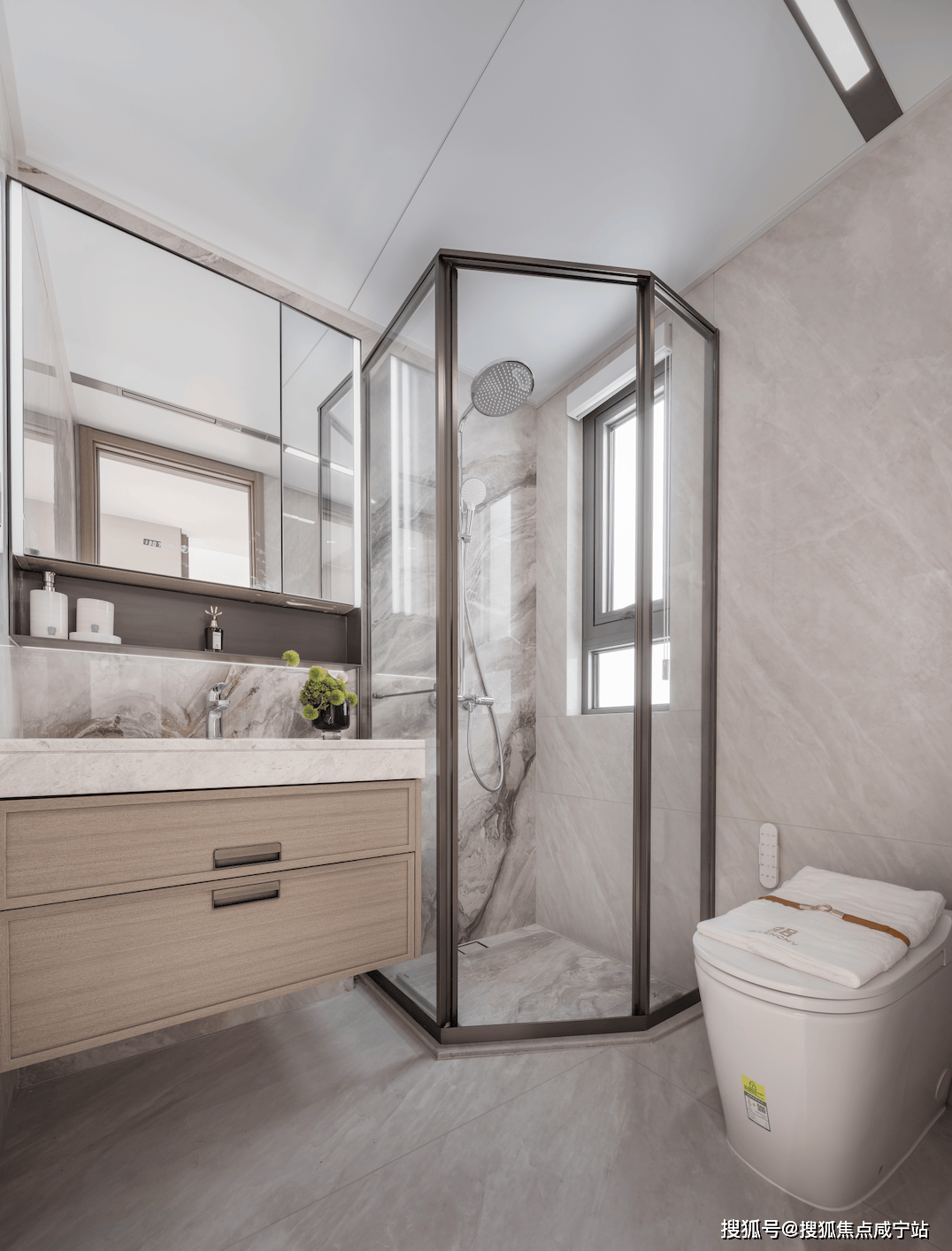 主卧套房式设计,约3.2m的主卧面宽,包括独立的卫浴和飘窗,演绎宽裕尺度。主卫中含大牌恒温花洒、洁具,魔镜内含美妆冰箱:高清镜面,恒温冷藏。
