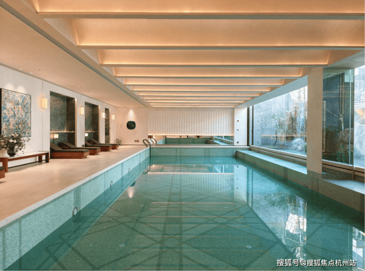 恒温泳池:采用全景落地玻璃墙,巧妙消融了室内与自然的界限。畅游其间,庭院山石如天然屏风倒映眼前,仿佛在自然山水间徜徉。