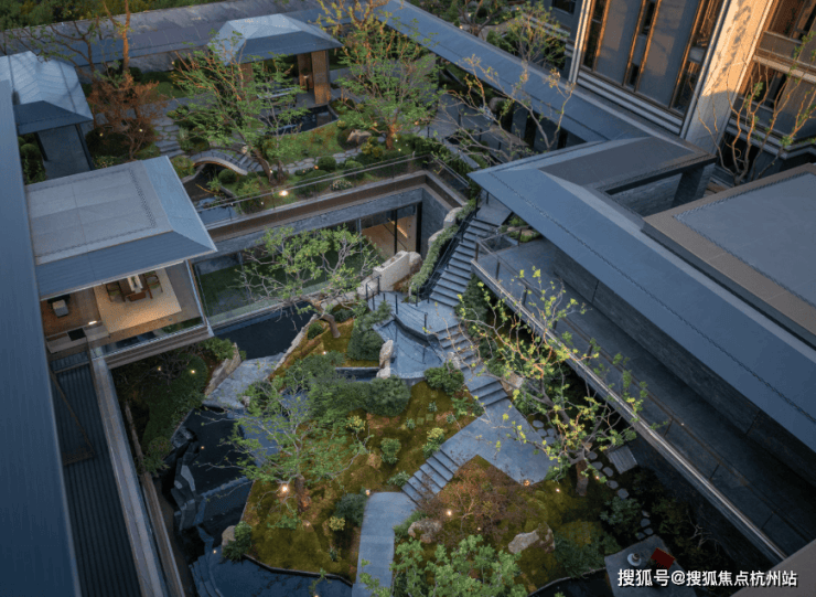再往里走就是近460㎡的下沉式庭院,精选太行山金景石堆叠成小山丘,引进溪水汇聚成池塘,并移栽岭南珍贵的古桩铁冬青和中华原生乌桕树,形成一幅立体山水画卷。