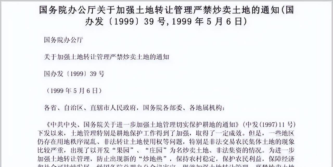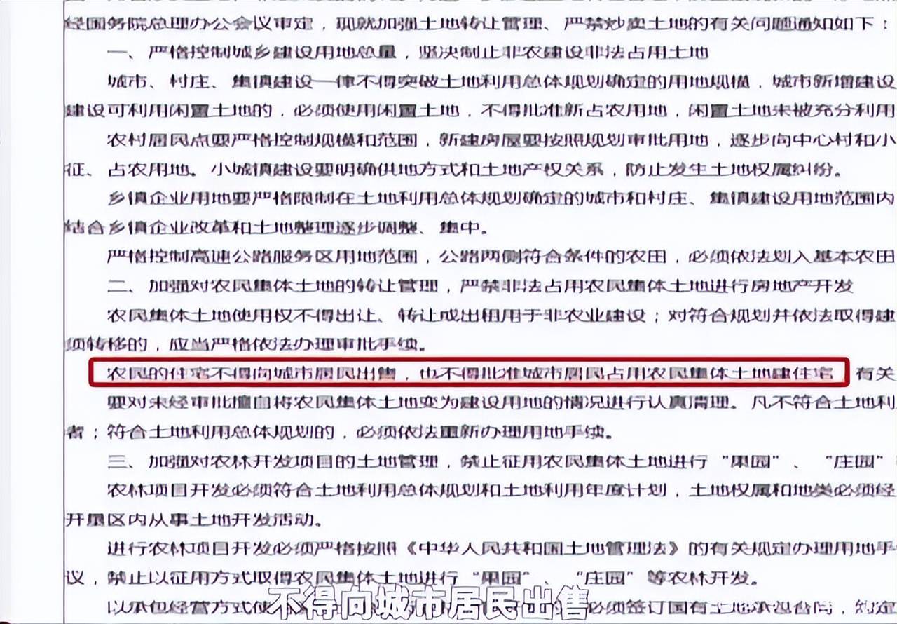 1999年,国务院办公厅出台了一项规定:农民的住宅不得向城市居民出售,也不得批准城市居民占用农民集体土地建住宅。