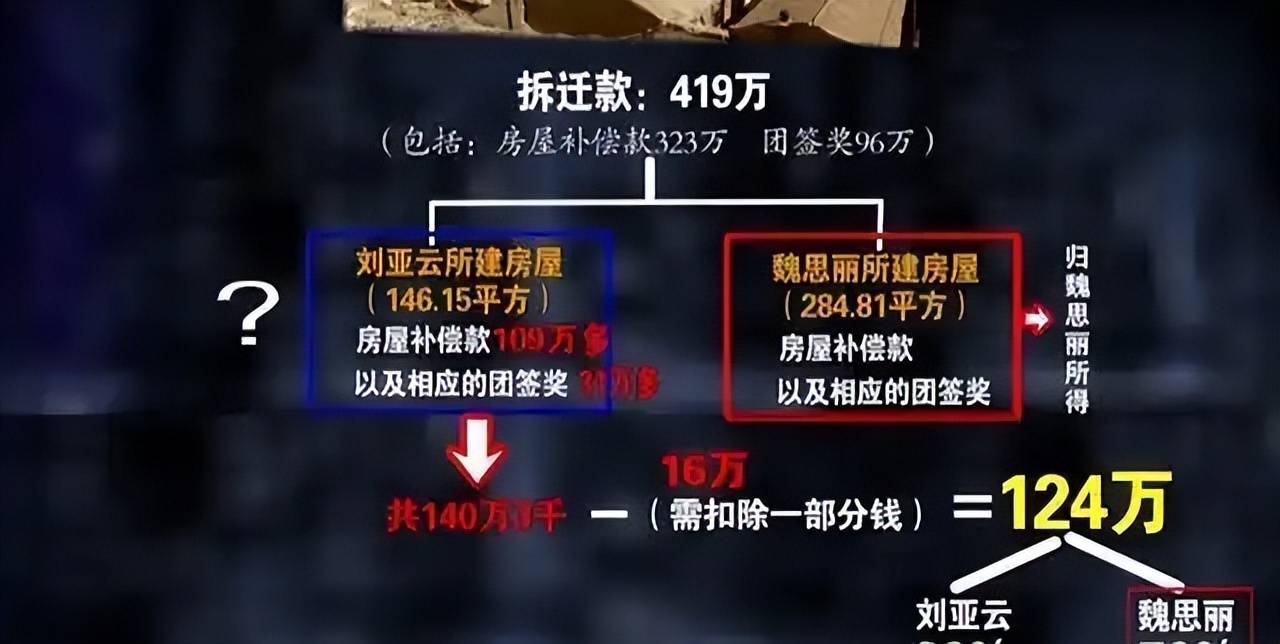 最终,根据计算,刘亚运原本房屋146平方,房屋补偿款是109万,团签奖是31万,总计140.3万,而扣除魏思丽当初的16万,大约为124万。
